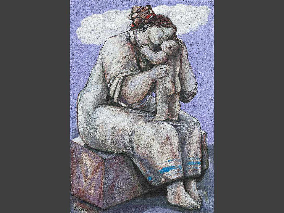 Le apparizioni delle sue grandi donneisole sono segnali di vita, fecondità, maternità da opporre ad un presente dominato dal gelo e dalla morte. È l’invenzione dell’artista che consente di scegliere una linea poetica originale per ridare senso alla visione, un sogno ad occhi aperti che prefigura un futuro diverso, anche se fragile. Immagini che appaiono e scompaiono sul filo dell’orizzonte, tra le onde del mare, in un presente dominato dal caos e dal dolore. È il sogno fantastico della poesia che si afferma sulla realtà e su un arido presente.