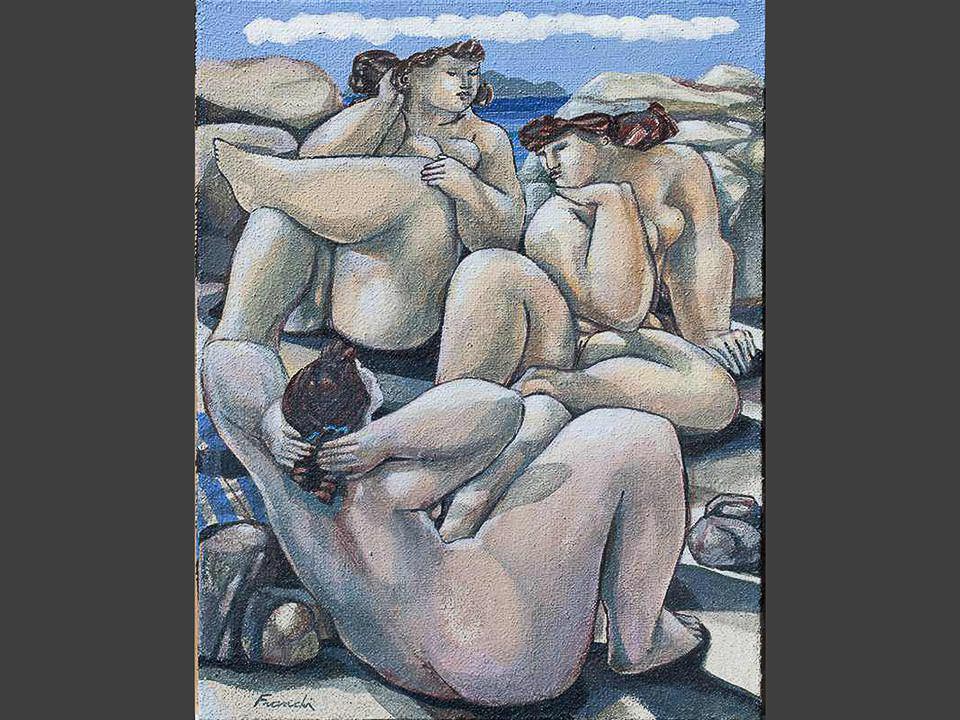 Vorrei iniziare il mio viaggio nei Sogni mediterranei di Franco Mauro Franchi, ospitati nella splendida cornice del Museo Archeologico di Fiesole, con le parole di Baricco che indica nel mare l’altro mondo, meraviglioso e terribile, lontano. Le grandi figure di donna che appaiono improvvisamente, nel verde e silenzio di Fiesole, sono apparizioni che provengono da un’epoca lontana, dal mito arcaico della bellezza femminile, dall’eterno viaggio di Ulisse. Sono presenze, isole di bellezza con uno sguardo perduto ed enigmatico, mistero senza tempo, fuori dalla cronaca e dalla realtà, ma con profondi richiami alla storia greca, romana ed etrusca.